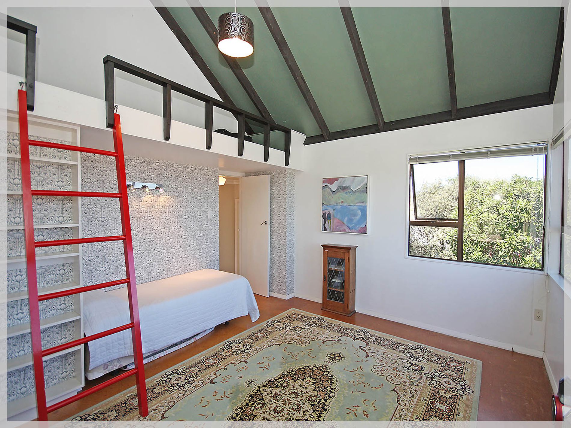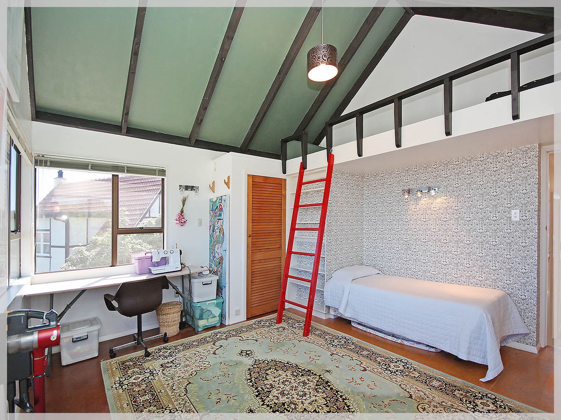 Come up the stairs to a landing area, leading to three double bedrooms, including one with loft style beds & a panoramic view that could be a studio or rumpus room. A separate & spacious home office with built-in shelving offers a work-from-home space, or the potential for a 4th bedroom