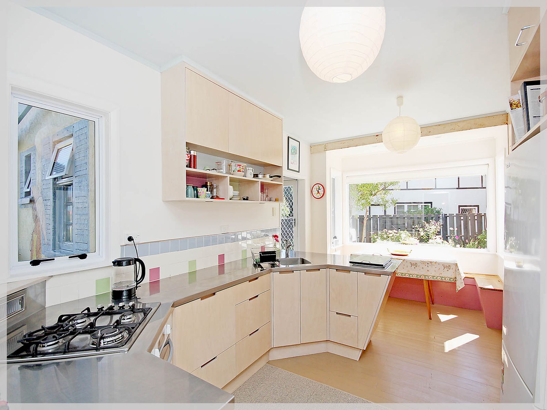 The two-level interior has a spacious 172sqm floor plan with light-filled rooms & a simple minimalism. While original features of varnished floors & wooden floors have been retained, the kitchen has been renovated in a style sympathetic to the era, with a sun-filled breakfast nook surrounded by a large bay-window.